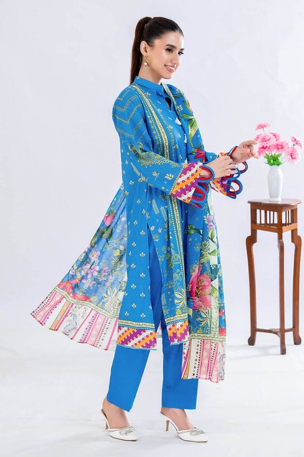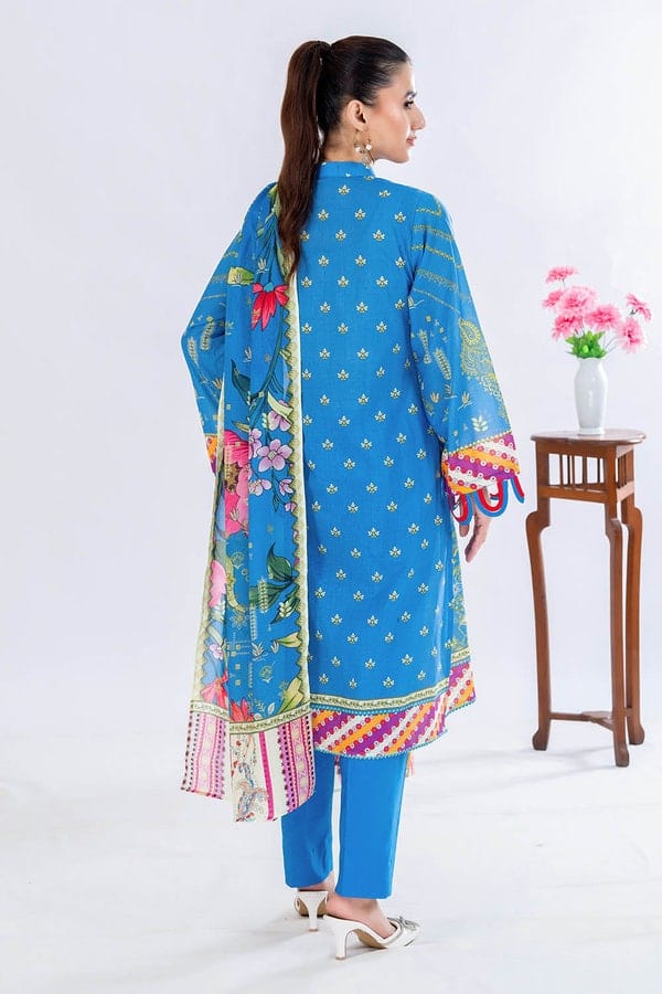 Refresh your summer wardrobe with this elegant 3-piece blue lawn suit, designed to keep you stylish and comfortable all season long. The set includes a beautifully printed lawn dupatta (2.25 meters), a stylish printed lawn shirt (1.75 meters), and a soft dyed trouser (1.75 meters), giving you the perfect blend of grace and comfort.