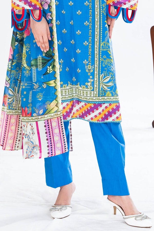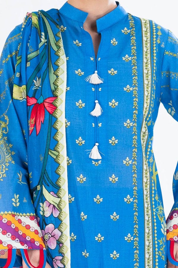 Crafted from breathable lawn fabric, this suit is ideal for casual outings, daytime gatherings, or festive wear. The vibrant blue shade adds a refreshing touch to your look, while the eye-catching prints enhance its charm. Pair it with your favorite accessories and footwear to create a chic, effortless style that stands out.