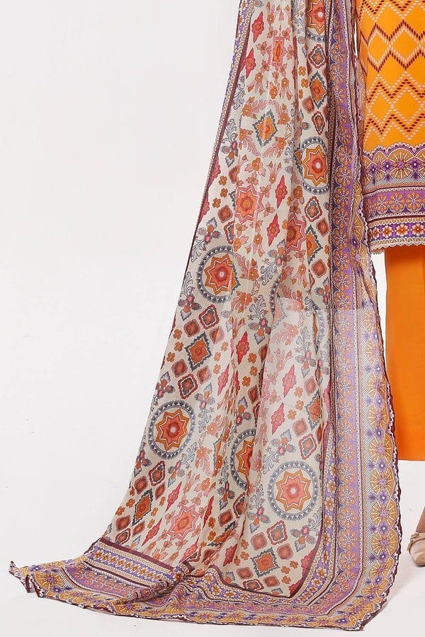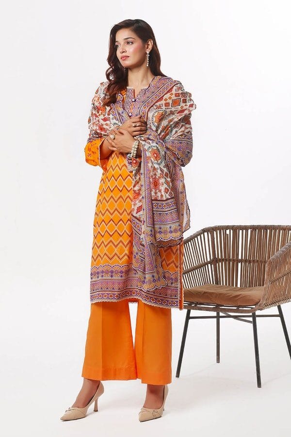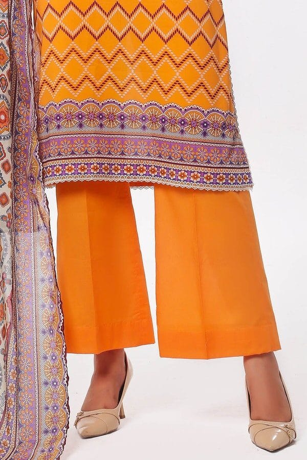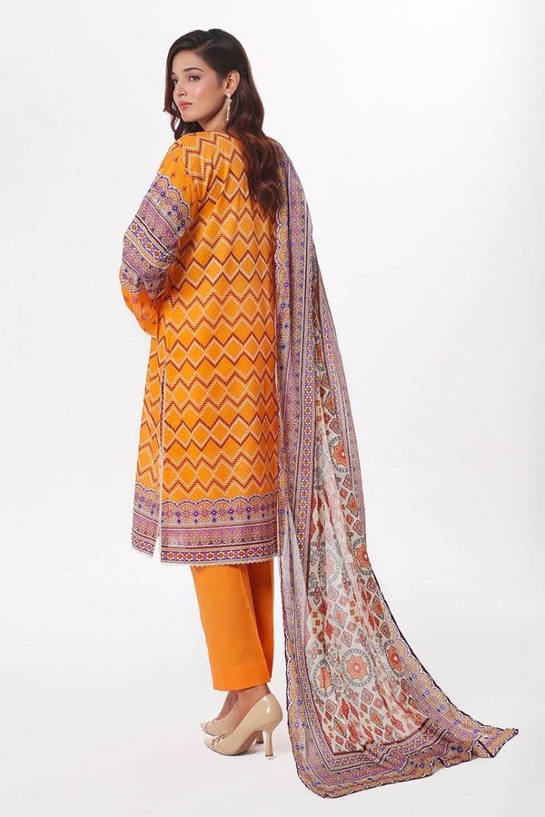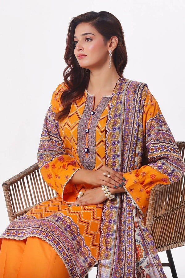 This unstitched ensemble includes a 2.3-meter Printed Lawn Dupatta, a 2.8-meter Printed Lawn Shirt, and a 2.5-meter Dyed Trouser. The fresh orange hue is perfect for summer gatherings, casual outings, and festive occasions. Crafted from breathable lawn fabric, it ensures comfort and elegance all day long. Pair it with your favorite accessories for a chic, stylish look. 🌸