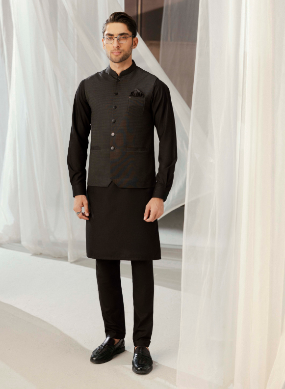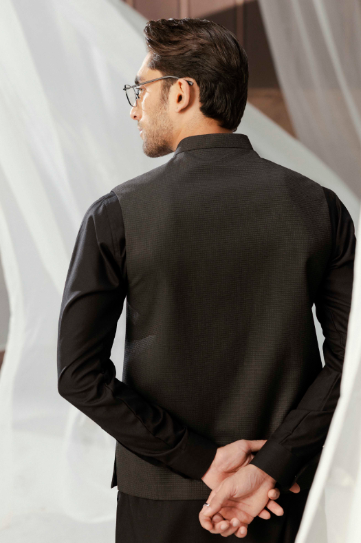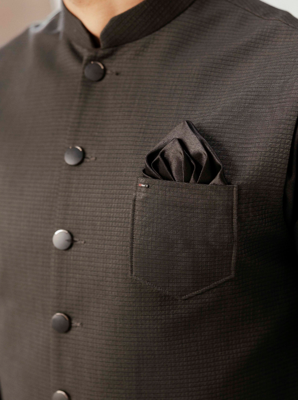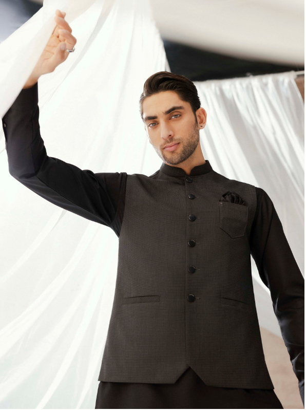 This men’s waistcoat is crafted from fine suiting textured fabric, tailored for a sharp and elegant look. Featuring an embroidered logo on the pocket, stylish piping detail inside, and fancy buttons, it offers a perfect blend of sophistication and modern design. Ideal for formal events, weddings, and traditional occasions.