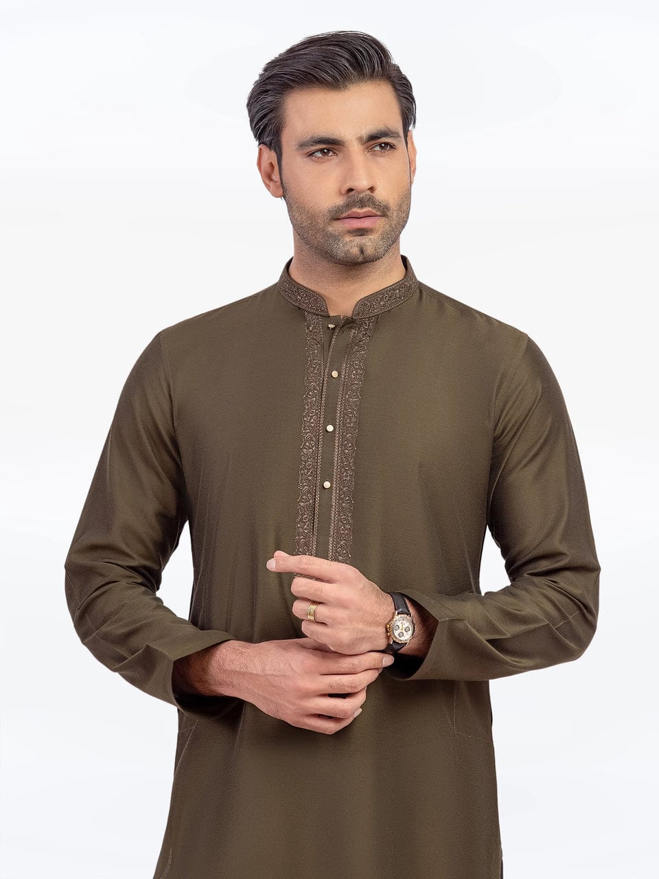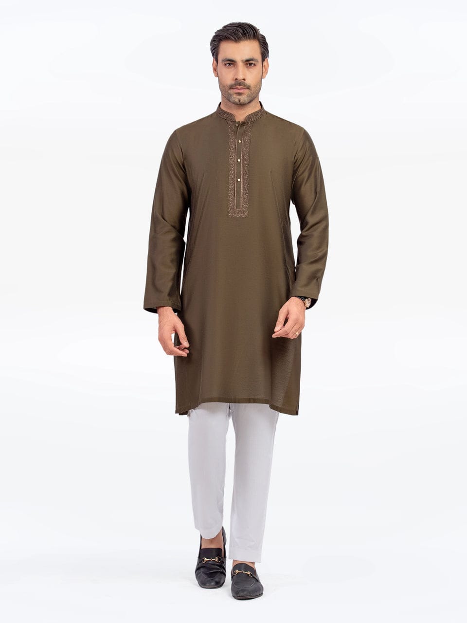 Elevate your festive style with this Men’s Tailored Fit Kurta, crafted from premium cotton-silk fabric for a rich and comfortable feel. Designed in a straight cut with intricate zari thread embroidery, this kurta exudes timeless elegance. The classy metal buttons add a refined touch, making it perfect for weddings, cultural events, and special occasions.