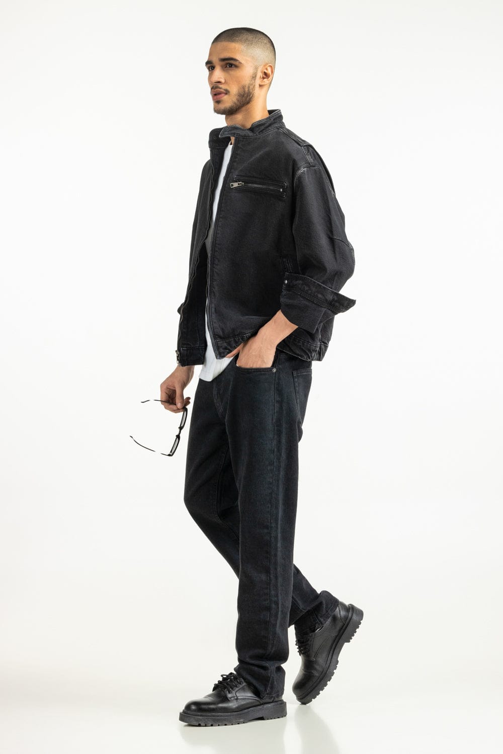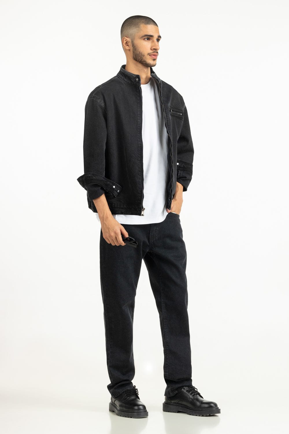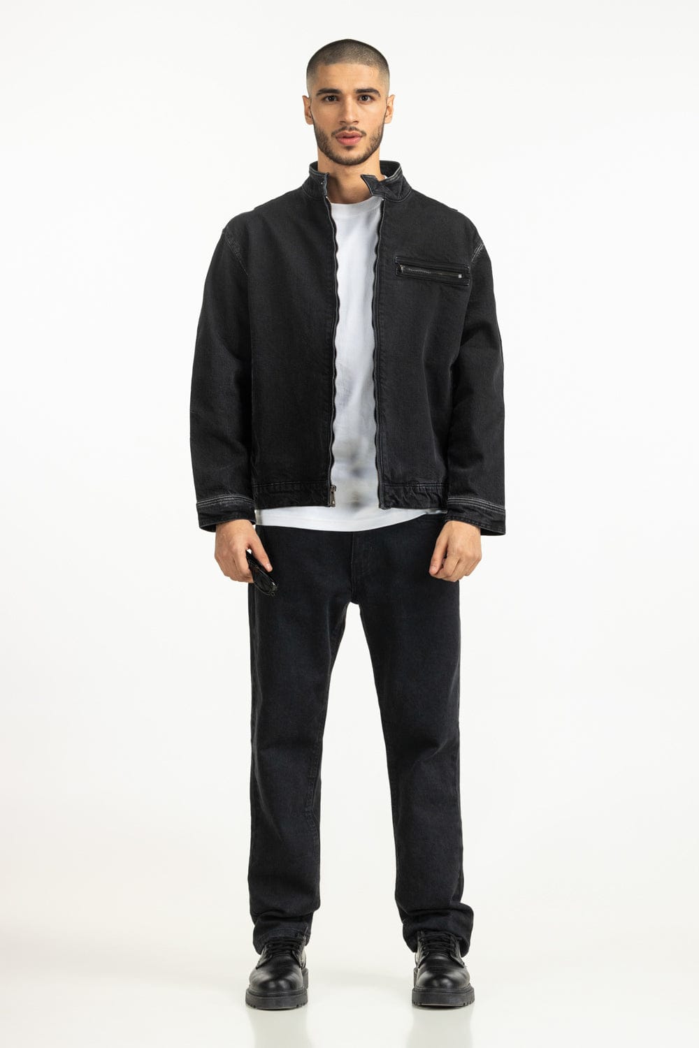 Sharp and minimal, this Regular Fit Jacket, it offers structure, while the band neck adds a refined touch. Finished with a sleek front zipper pocket, it combines function with timeless sophistication.