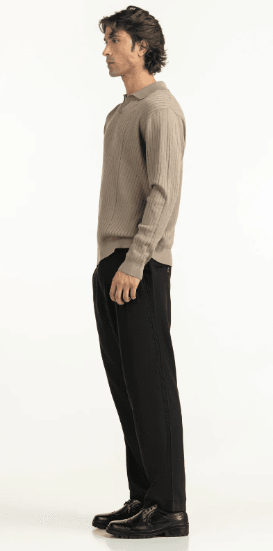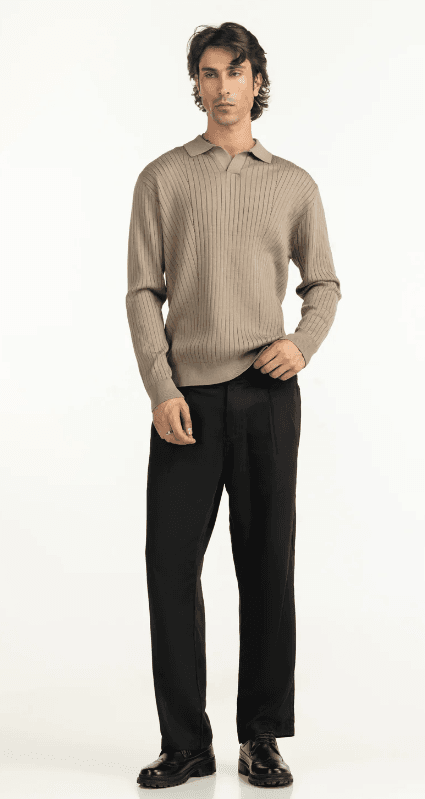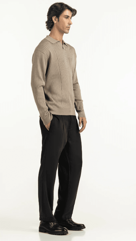Reset your winter wardrobe with this textured khaki polo. Its elegant knit and clean lines offer a fresh take on a classic silhouette, perfect for those with a refined, youthful aesthetic. Designed for comfort without compromising on a sharp look, this piece transitions seamlessly from casual outings to semi-formal settings.