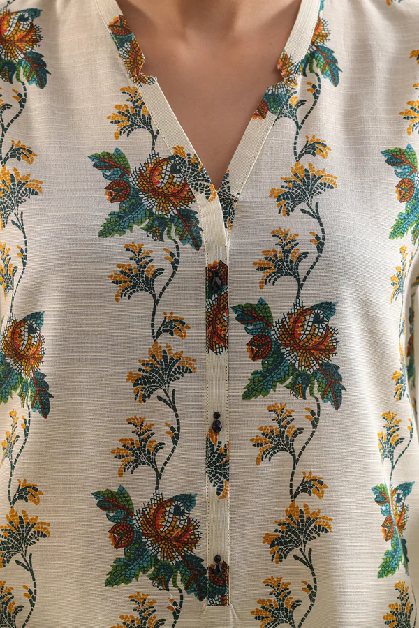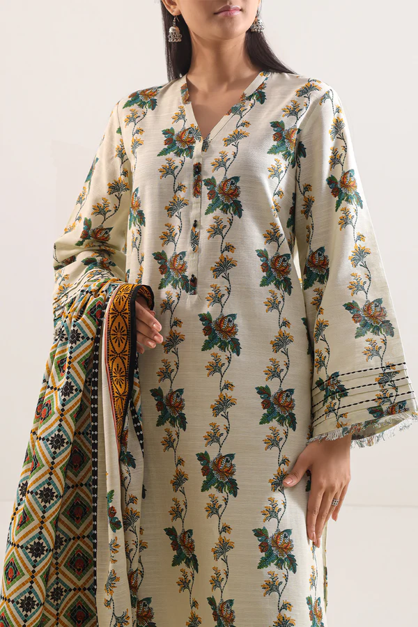 Unstitched 3 Piece Printed Cotton Khaddar – Ivory