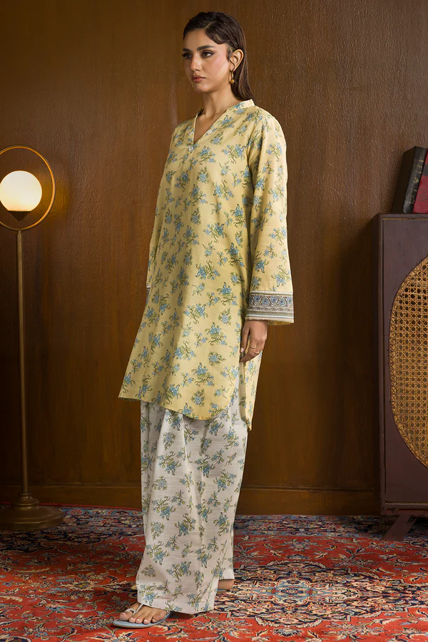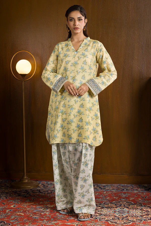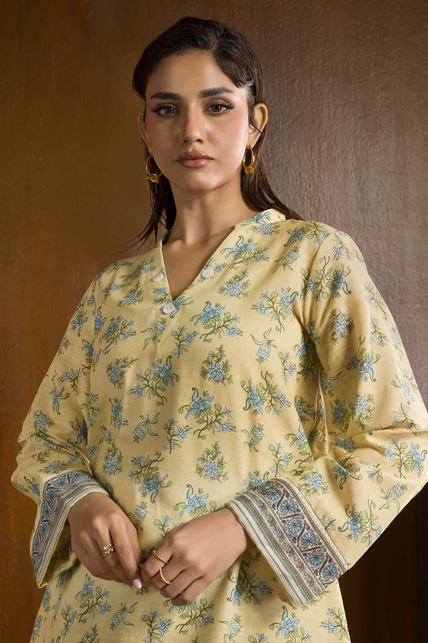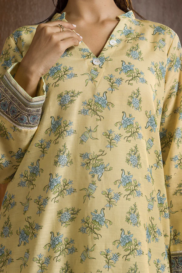 Step into effortless style with this Yellow Printed Khaddar Kurta Trouser Set.
